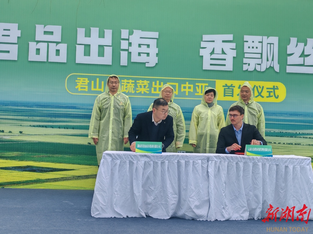 出口首发仪式现场,君山农垦集团与俄罗斯外商代表丹尼斯共同签署《君山蔬菜出口中亚地区框架协议》。这标志着君山蔬菜成功打开中亚市场大门,湘味农产品将沿丝绸之路“鲜”达远方。