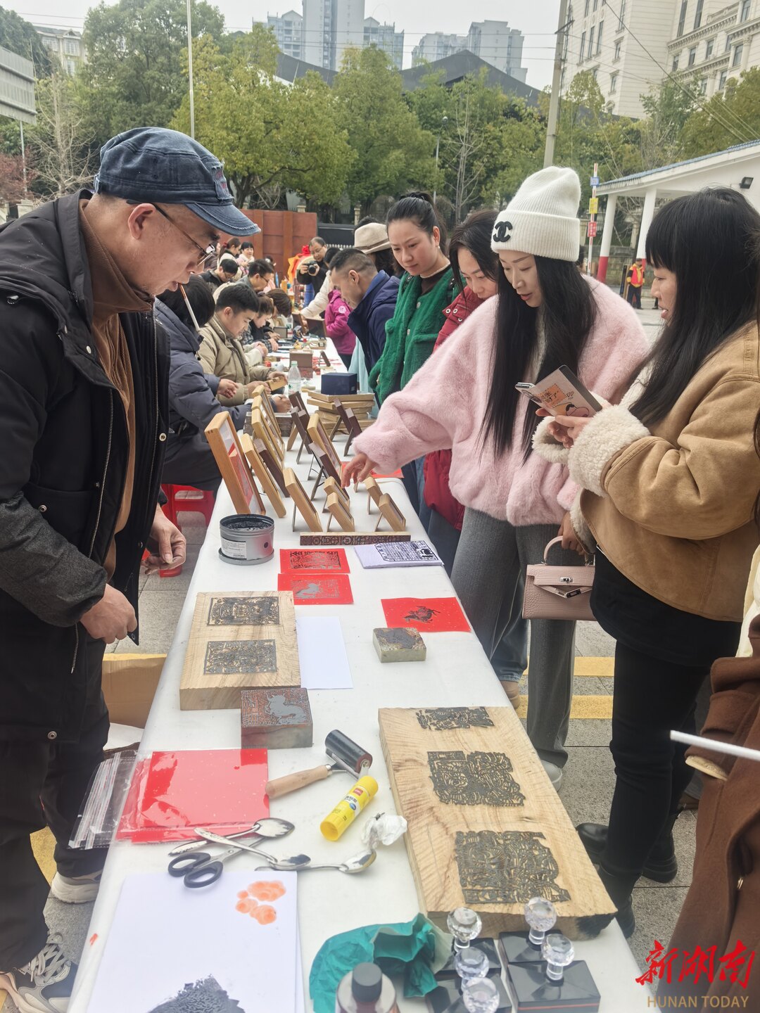 与本次展览配套的游园活动也十分丰富,文创集市、拓印体验、艺术家写春联送福字、新书推荐、亲子游戏等,吸引大量市民驻足参与,其中,湘西印社推出的篆刻、木刻文创产品,人气火爆,首次开通直播,网络订单破百。