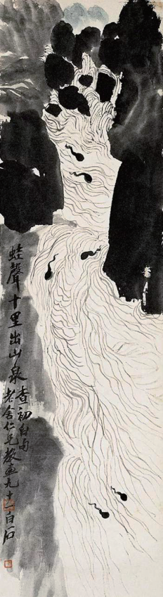 一次,老舍用一首古诗中的千古名句“蛙声十里出山泉”来请91岁高龄的白石作画。十分考验画家的智慧啊!但白石是何等人!他拿起画笔想了又想,落在纸上是一股“穿山透地不辞劳”的清泉,水中一群小小的蝌蚪在嬉戏,仿佛听到了鼓噪的蛙鸣与潺潺的流水声相应和——此时无声胜有声!你看这画有多奇多美多峭拔,能不成为千古奇作吗?能不使人拍案叫绝吗?