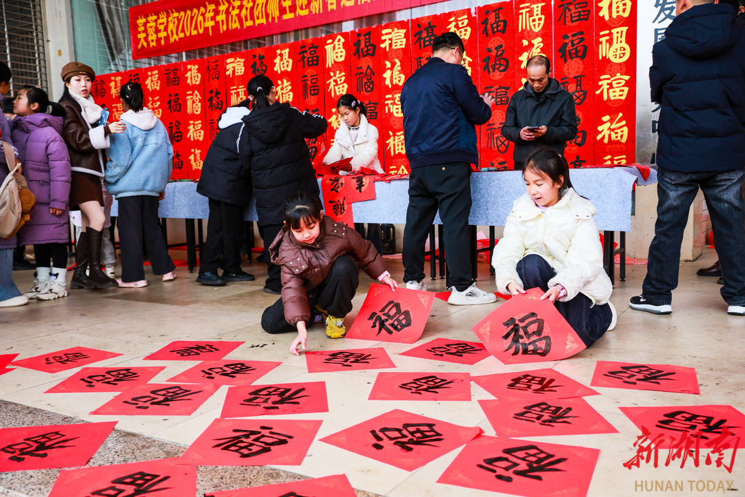 2月11日,新田县文体中心,学生们和书法家一起为群众书写春联,送上新春祝福。当天是农历的南方小年,新田县文联组织县书法家协会书法家和该县芙蓉学校书法社团师生开展“迎新春写春联送祝福”活动,现场挥毫泼墨给群众书写春联和福字,喜迎马年新春佳节的到来。刘贵雄 摄影报道