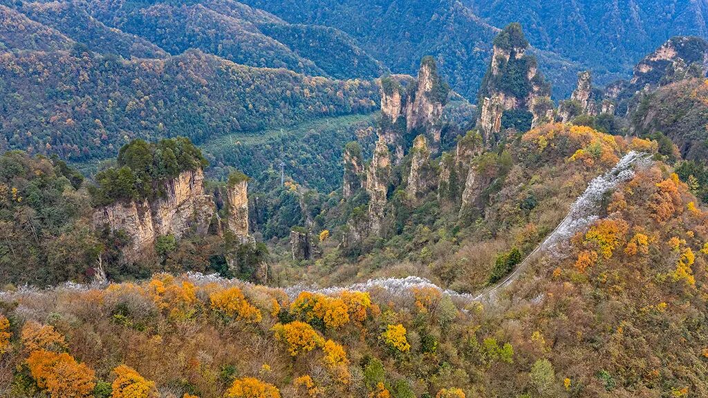 秋霜为天子山的金色山林镶嵌上一道银边,装点出别样的秋色。