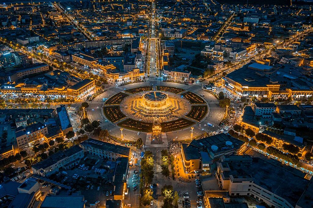 夜色中的特克斯八卦城,街道灯光勾勒出独特的八卦形制,神秘而壮观。