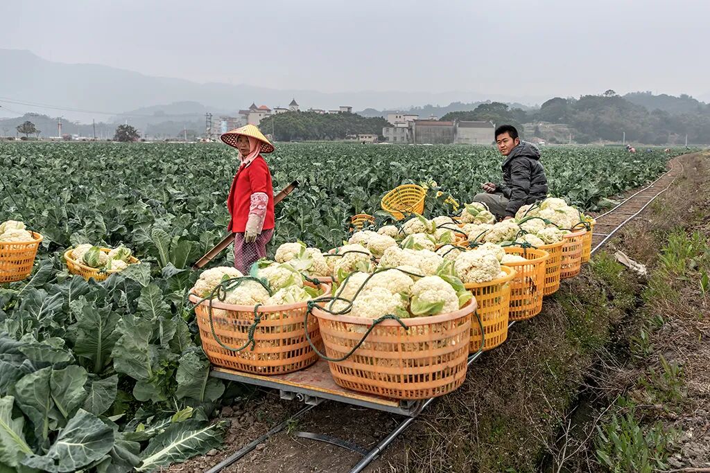 田间地头,菜农们正利用铺设在田垄上的轨道,轻松运送刚采摘的花菜。