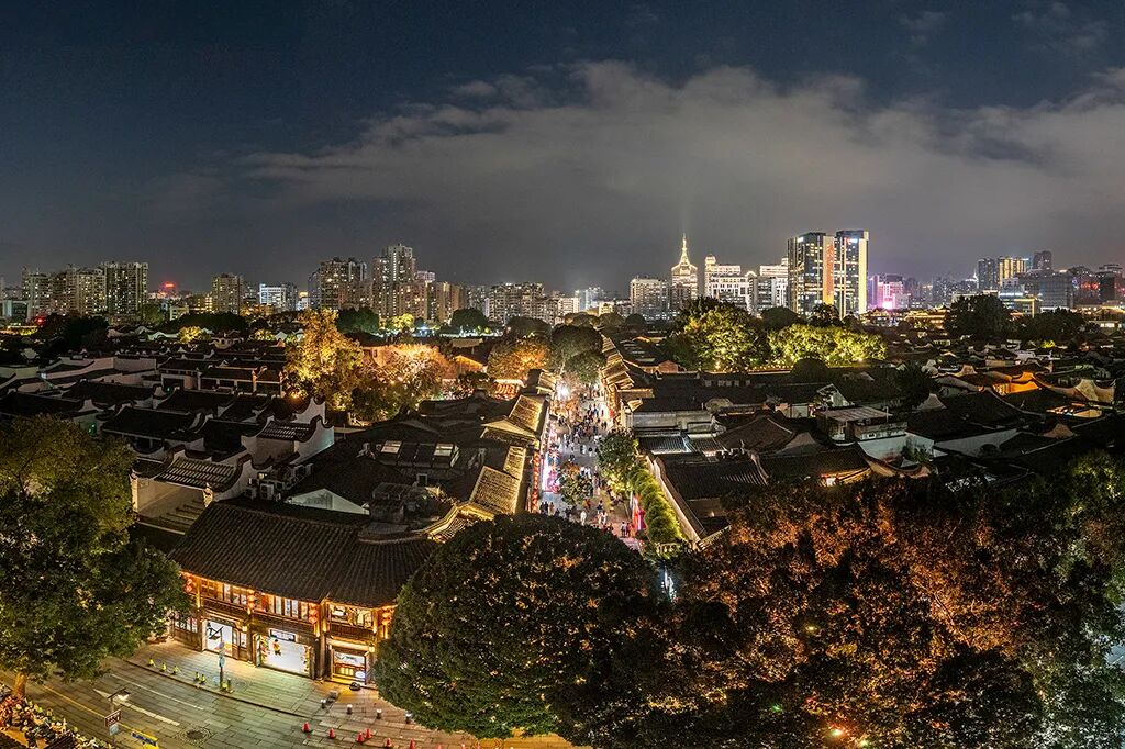 夜幕下的三坊七巷,古厝的灯火与远处现代建筑的霓虹融为一体,历史在夜色中静静流淌。