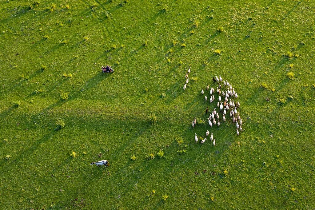 夕阳西下,牧民赶着羊群走在昭苏草原上,绿草如茵,光影如画。