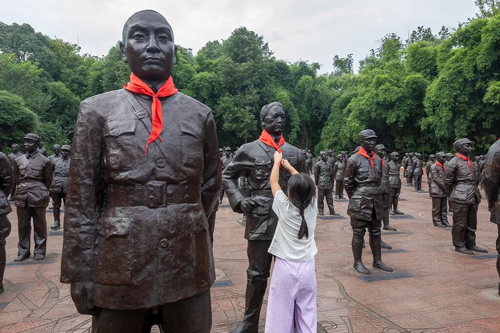 建川博物馆的抗战壮士雕像前,一位小女孩正自发地为雕像系上红领巾。