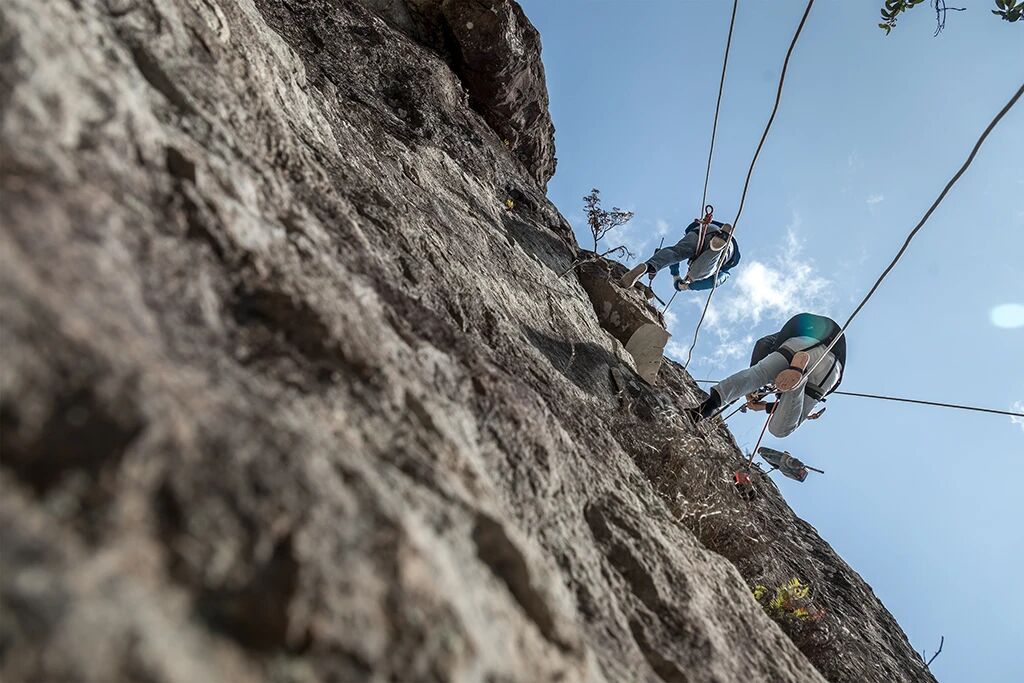 景区工作人员在险峻的山崖边作业,仔细清理松动的石块,守护游客的安全。