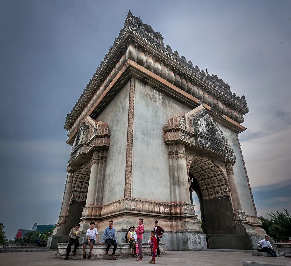 首都万象的凯旋门前,一群年轻人正在休憩交谈。