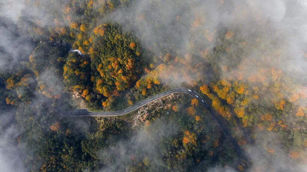 云雾缭绕的光雾山,秋色正浓,宛如一幅水墨画卷。