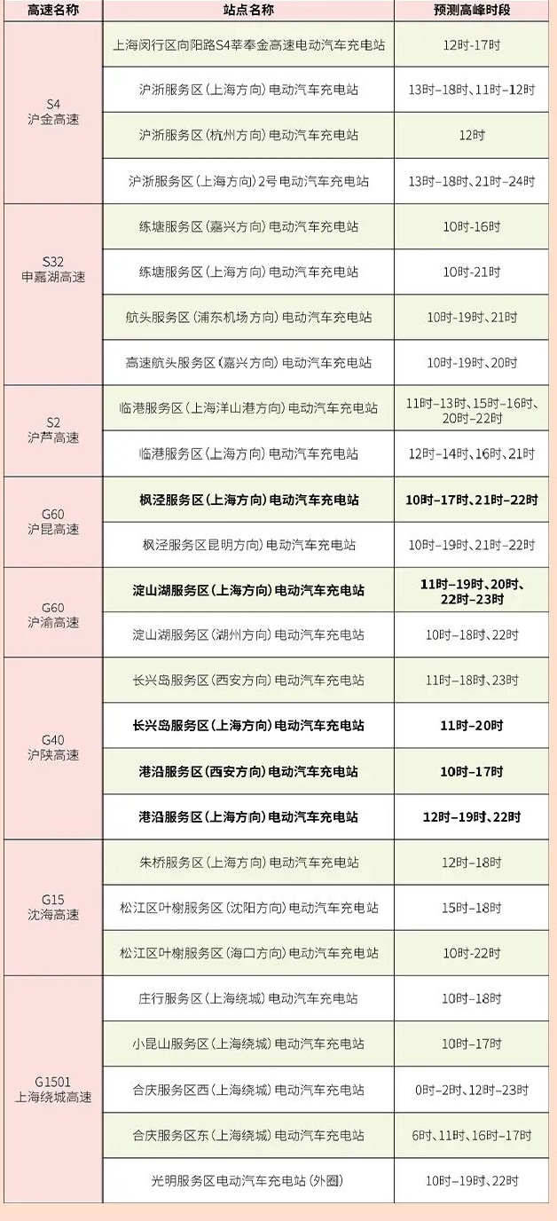 具体到各站点,充电高峰时间也不尽相同,如G60沪昆高速枫泾服务区(上海方向)电动汽车充电站的预测高峰时间为10时至17时、21时至22时,G40沪陕高速长兴岛服务区(上海方向)电动汽车充电站的高峰时间则为11时至20时,G40沪陕高速长兴岛服务区(西安方向)电动汽车充电站的充电高峰时间则为10时至17时。