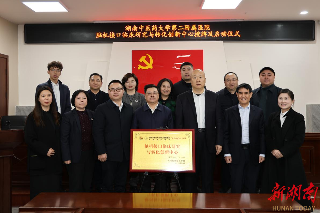 大众卫生报·新湖南客户端2月12日讯(通讯员刘丹 曹闲雅 袁利)为积极响应国家科技创新与“健康中国”战略,推动中医药康复与现代前沿技术深度融合,2月11日下午,湖南中医药大学第二附属医院(湖南省中医院)脑机接口临床研究与转化创新中心正式成立。湖南中医药大学党委书记、湖南省康复医学会会长戴爱国,湖南省康复医学会副会长邓景贵、副秘书长沈杰及医院在家领导班子出席启动仪式。仪式由医院副院长邓桂明主持。
