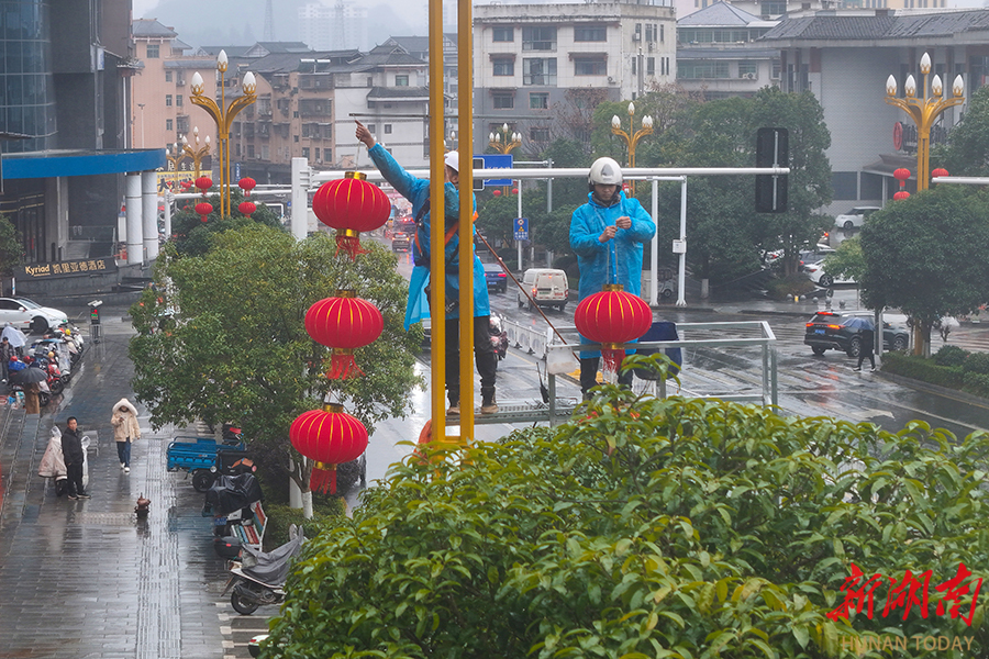 2月12日,通道侗族自治县长征路,工人在悬挂红灯笼。春节临近,当地大街小巷的红灯笼高高挂起,洋溢着喜庆的节日氛围。李尚引 摄(湖南图片库)