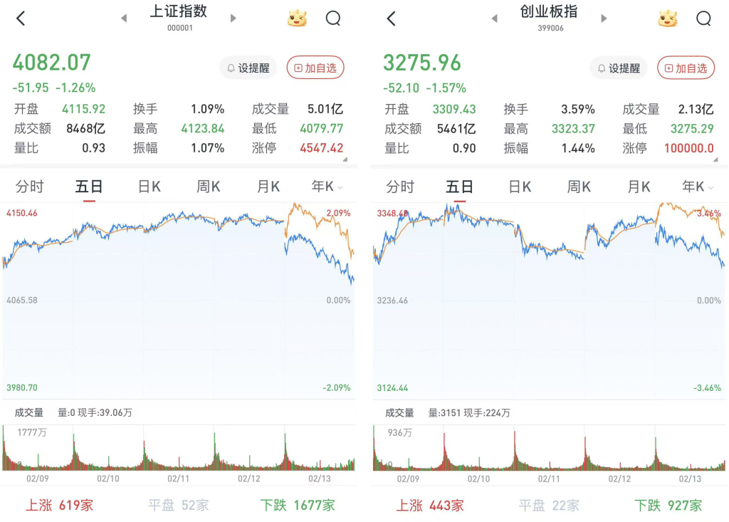 A股三大股指2月13日集体低开。全天市场呈现震荡下行的走势,尾盘跌幅扩大。