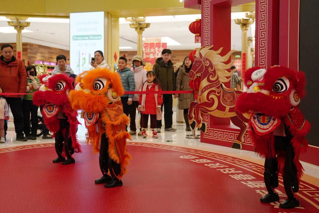 门口是机器人舞狮表演的舞台,三只“小狮子”正在进行演练,左摇右摆、摇头晃脑的,煞是可爱。再往里走,新春许愿塔已经搭建好了,高大的塔身上,国潮版、非遗版、科技版、剪纸版风格的奔马图轮番亮相。等活动开始的时候,人们可以通过互动装置把自己的祝愿“写”到塔身上。