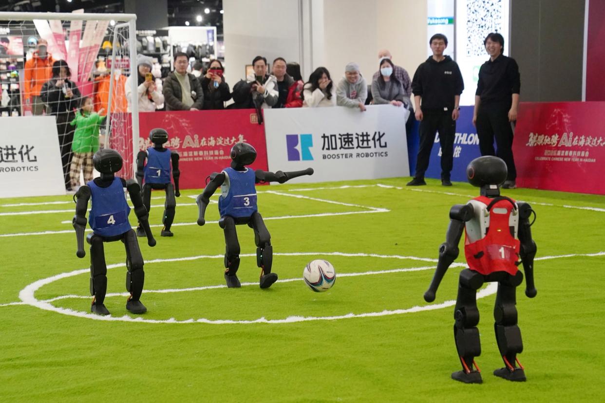 去年首届海淀新春科技庙会上火“出圈”的机器人足球赛,今年全新升级归来。相对于去年的2V2,今年不仅升级为3V3,还是纯AI自主决策对战,能实时捕捉球路与赛场动态,完成跑动、射门等复杂动作,还能将信息与“队友”同步,让配合更默契。