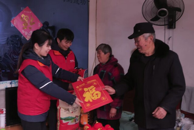 巡检结束,队员们分头前往留守老人家,送上大米、食用油,在门框上贴好春联。