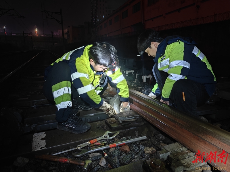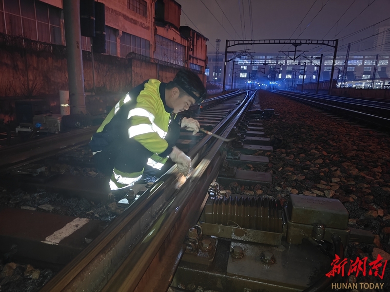 2月13日凌晨,长株潭城际铁路株洲站城际场,信号工正一丝不苟地检修信号设备。春节临近,中国铁路广州局集团有限公司长沙电务段工作人员坚守一线,加强设备巡检维护,全力护航春运安全。邓昊 胡志刚 摄影报道(湖南图片库)