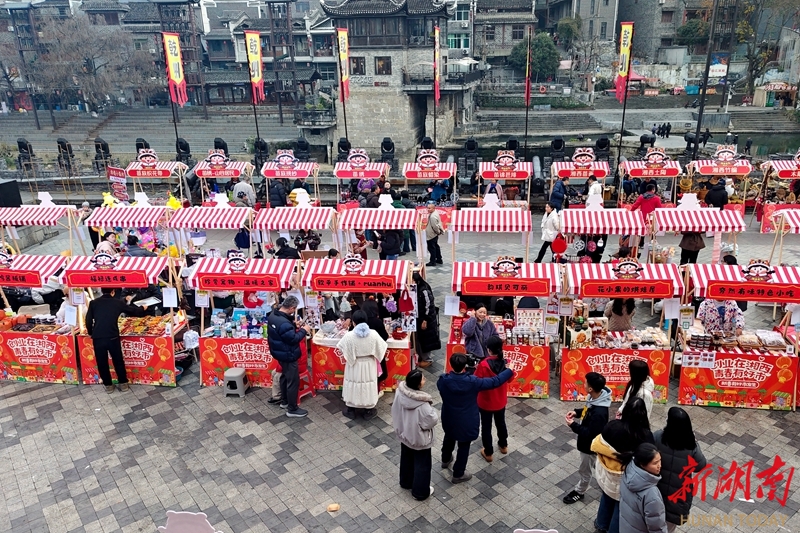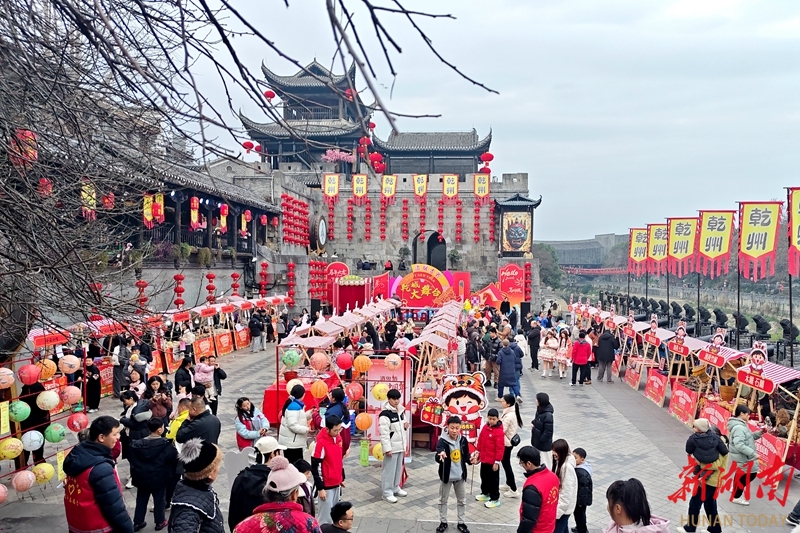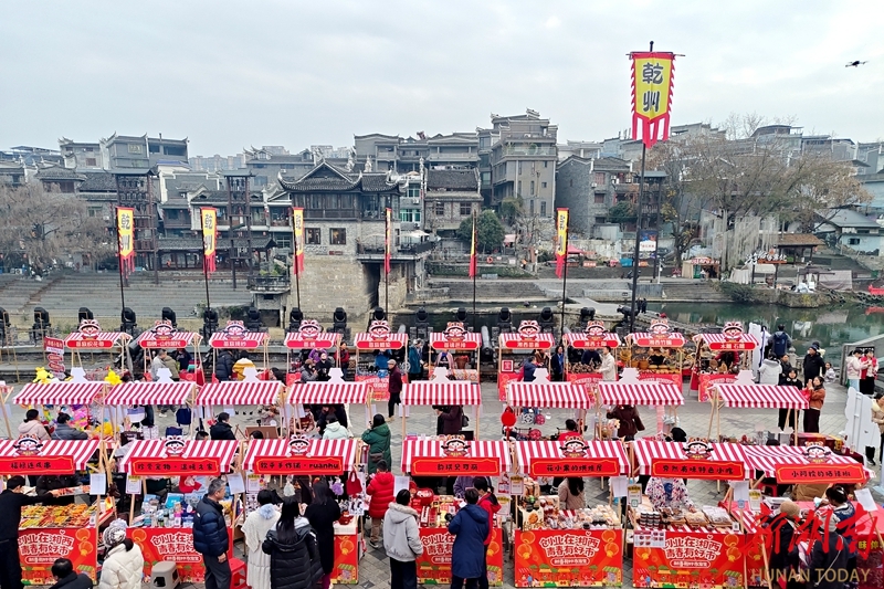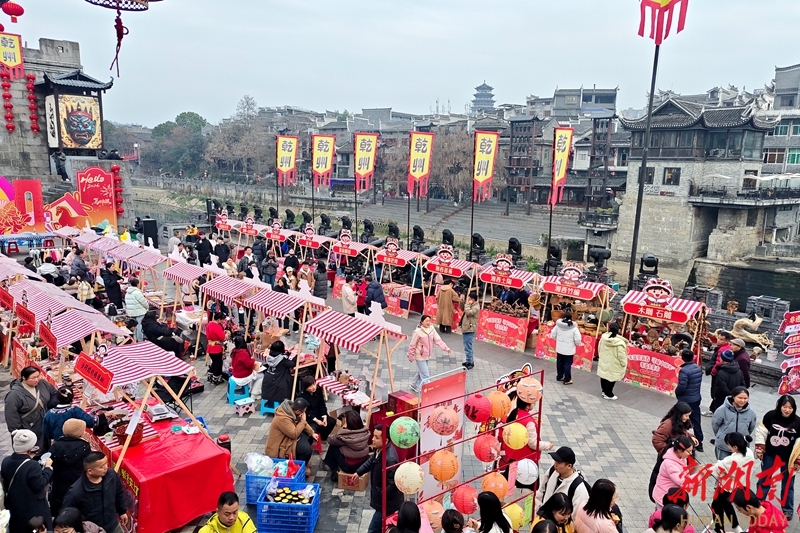 2月12日,吉首市乾州古城三门开广场,市民和游客在选购年货。日前,湘西州青年创业新春市集热闹开市,30家涵盖地道小吃、非遗文创、潮趣手作、年货好礼等经营主题的青春小店集中亮相,吸引了众多市民和游客前来挑选特色年货、体验年俗游戏、领取手写春联,感受浓郁年味。彭彪 摄(湖南图片库)