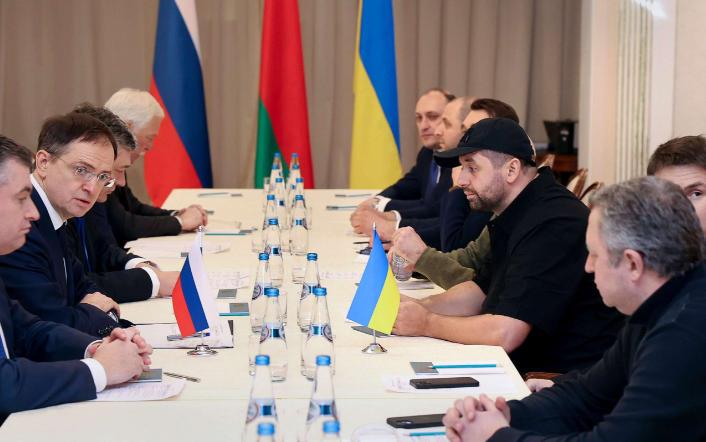 △2022年2月28日,白俄罗斯戈梅利州举行首轮俄乌谈判。梅金斯基(左2)作为俄谈判代表团团长列席。