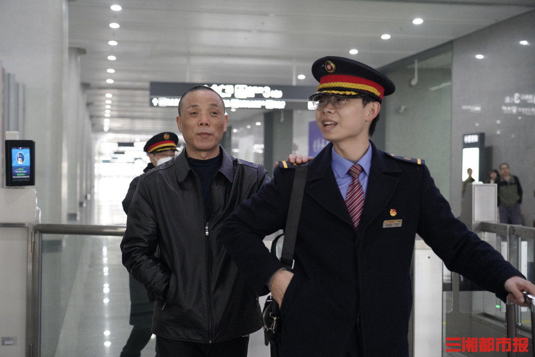 三湘都市报·新湖南客户端2月14日讯(全媒体记者 李致远 通讯员 唐小平 李悦)“谢叔叔,这边走,慢一点。”2月11日,南方小年,常德站11站台人潮涌动,志愿者刘凯明叮嘱着盲人旅客谢文井。谢文井将轻轻搭在志愿者肩头,脚步从容。这份跨越了十年的温暖搀扶,是他春运归途上最安心的依靠。