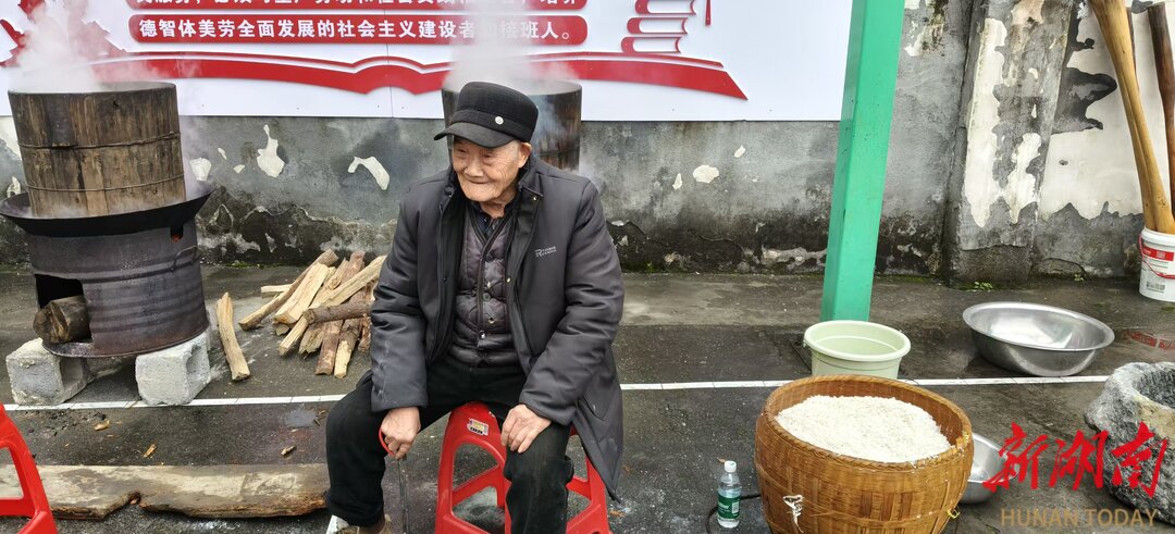 舞台另一角,暖意更浓。今年88岁的龚家银正忙着往炉灶里添柴火,旁边临时支起的铁锅中,甑笼冒着热气,香气四溢。“我们准备了110斤浸泡好的糯米,蒸熟后用旁边的石臼打成糍粑,让今天来参加活动的每一位客人,都能尝到我们自己的土特产,感受我们的热情。”龚家银说道。