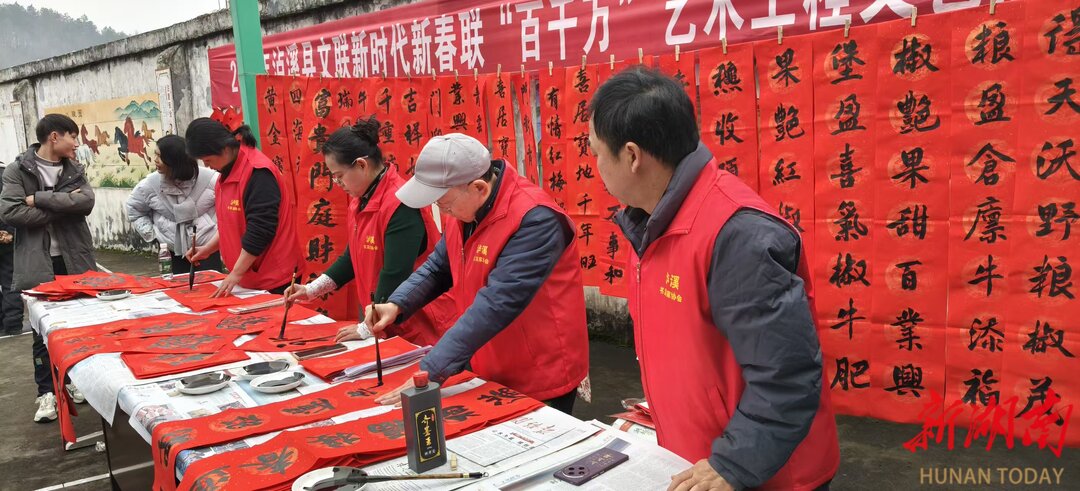 现场还设置了拔河、打糍粑等趣味互动活动,让村民在参与中体验乐趣、增进情谊;同时,县书法协会的书法家们现场挥毫泼墨,免费为村民书写新春对联,送上满满的新春祝福。本次活动为参演人员准备了两斤半土猪肉作为暖心年货,让大家在付出中收获温暖、感受关怀。