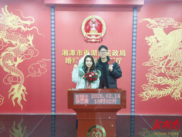 湖南日报·新湖南客户端2月14日讯(通讯员 吴贵贤)2月14日,雨湖区婚姻登记建设北路工作点与万楼工作点同步迎来领证高峰。作为全省首创的“婚登+文旅”特色区域,雨湖区以升级服务、主题活动与便民举措,让新人在古韵新风与新春氛围中,定格爱与团圆的幸福时刻。