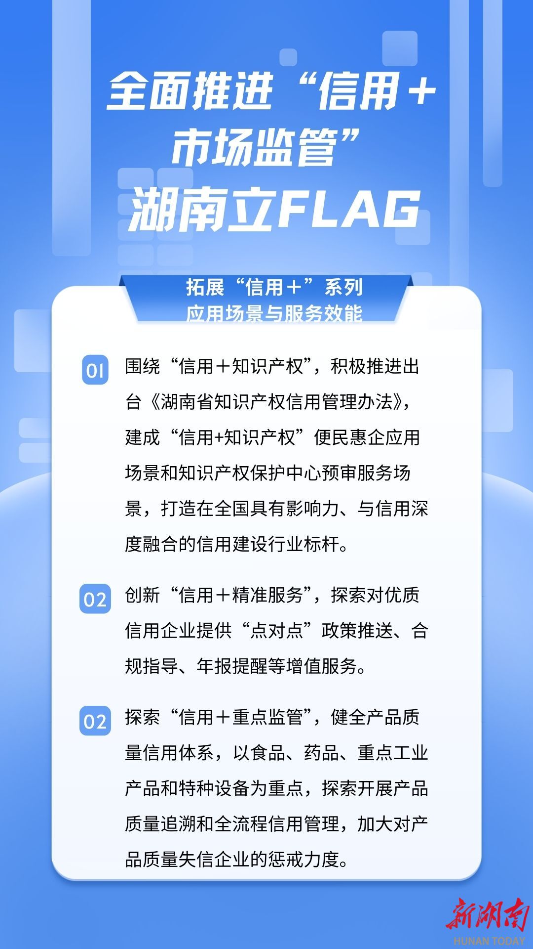 第五,“信用”能当“通行证”,能办事、能融资、能享服务。就是把“信用”的用处拓展到方方面面:比如保护知识产权,将积极推进出台《湖南省知识产权信用管理办法》,让守信企业在知识产权保护上更有优势;信用好的企业,还能收到市场监管部门“点对点”的政策推送、合规指导,不用自己到处查政策;更实用的是,企业的信用报告能和银行贷款挂钩,和“湘信贷”平台打通信息,帮守信企业更容易贷到款、降低融资成本,解决小微企业“贷款难”的痛点。同时,在计量、标准化、产品质量等领域,也会充分发挥信用的基础性作用,帮企业做好信用管理、防范风险。