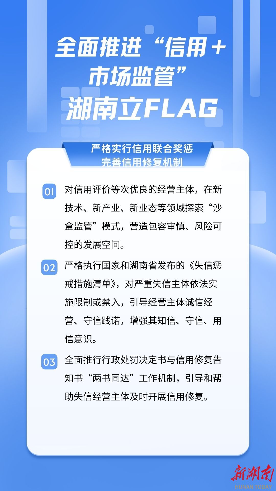 第六,奖惩分明,失信了也能“改过自新”。守信的企业,除了享受各种便利,在新技术、新业态领域,还能享受“沙盒监管”,也就是在风险可控的前提下,放心创新试错。而失信的企业,会被严格惩戒,限制进入相关行业。但也不是一棍子打死,湖南会全面推行“两书同达”——给企业送行政处罚决定书的时候,同步送上信用修复告知书,清晰告诉企业怎么整改、怎么修复信用,而且信用修复能“全程网办”,不用跑腿,帮失信企业尽快“洗白”,重新正常经营。另外,企业的红黑名单会在“信用湖南”网站公示,让大家看得明明白白、监督得实实在在。