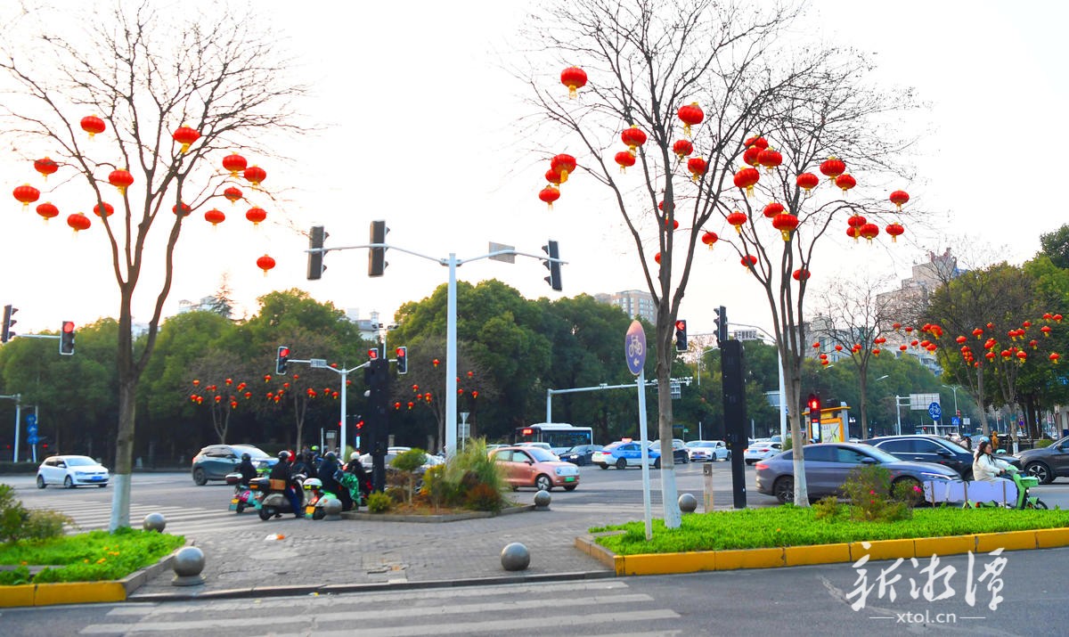 随着春节临近,湘潭街头巷尾的年味愈发浓郁。市风景园林中心在全市范围内扎实开展节日氛围营造工作,一盏盏大红灯笼、一组组鲜艳的“福”字被精心悬挂在树木枝头、灯杆两侧,与五彩斑斓的花卉景观相互映衬,让市民感受到扑面而来的新春气息。