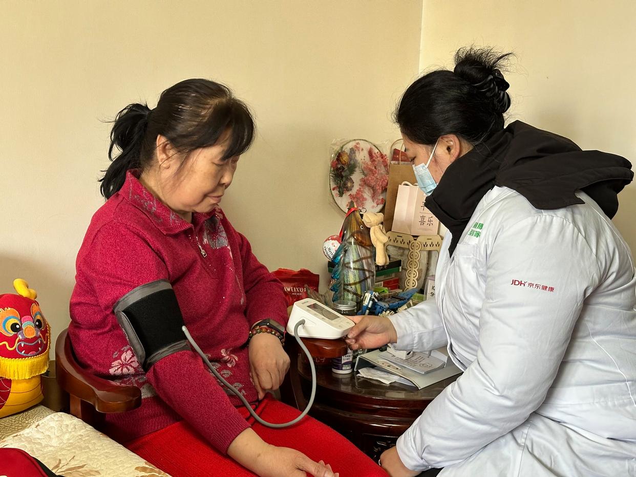 △护士上门为贾阿姨测量血压