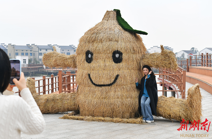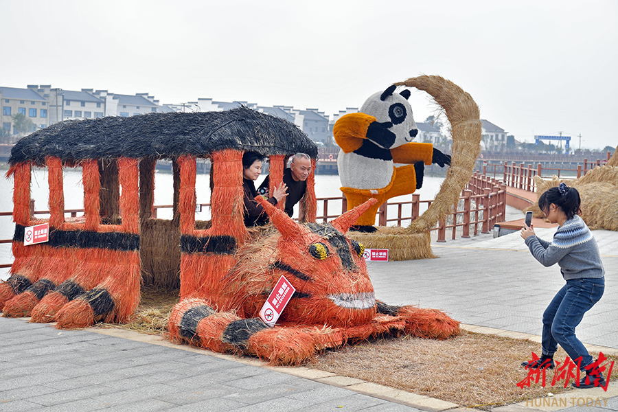 2月15日,岳阳市屈原管理区河泊潭文化旅游区,游客在稻草人艺术装置前拍照打卡。当天,2026年河泊潭新春民俗游园会暨稻草人艺术节正式开幕。30组以农业废弃物制作的巨型稻草人艺术装置惊艳亮相,为游客带来沉浸式新春体验。 湖南日报全媒体记者 田超 摄