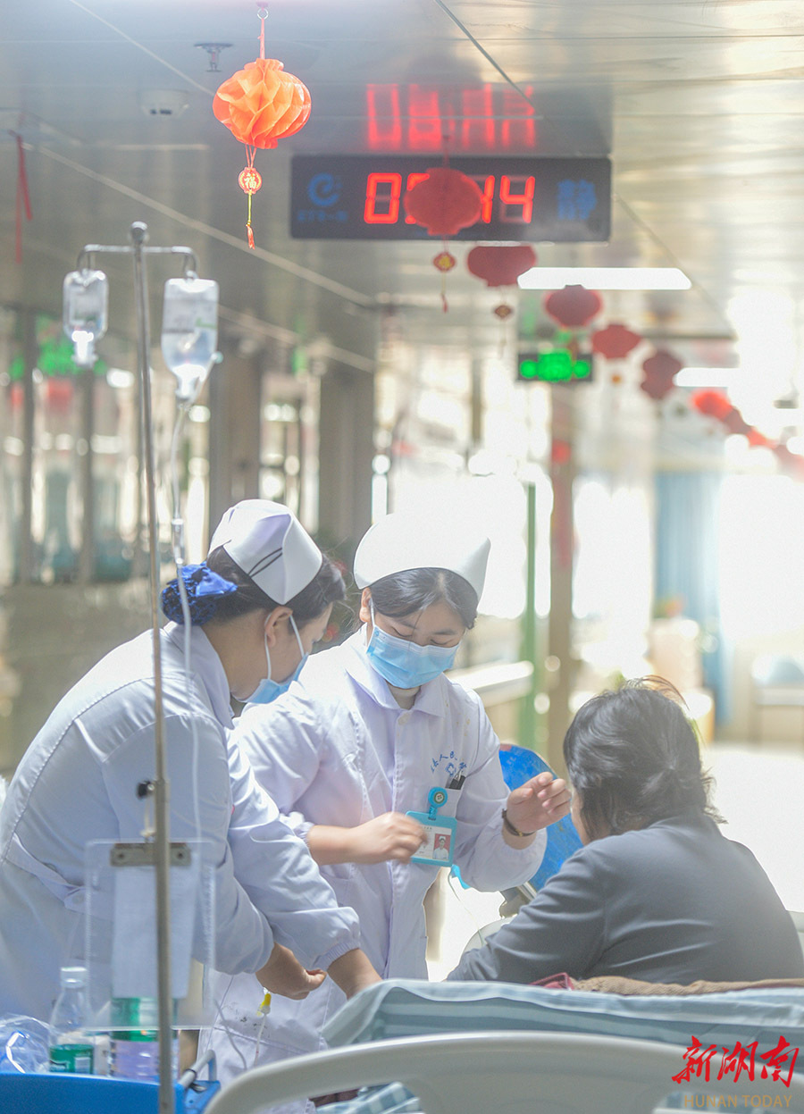 2月15日,在湖南省永州市道县人民医院呼吸内科,护士在给患者输液。当天,春节假期首日,各行业工作者坚守岗位,保障城市有序运转。 蒋克青 柏华林 摄影报道(湖南图片库)