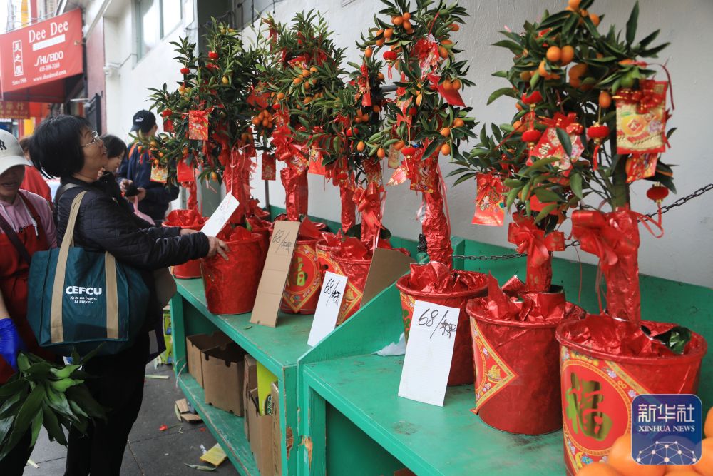 ↑2月15日,在美国旧金山唐人街,一名女子在迎春花市选购年桔。