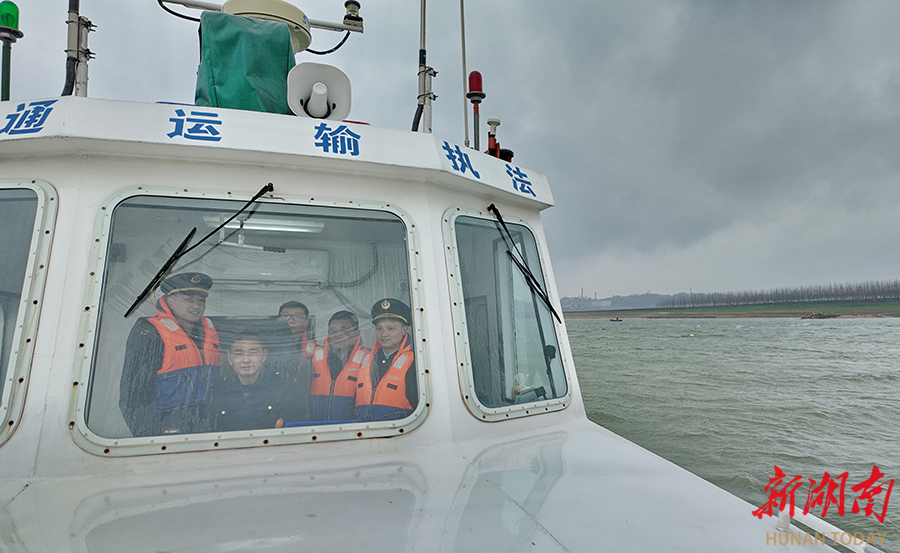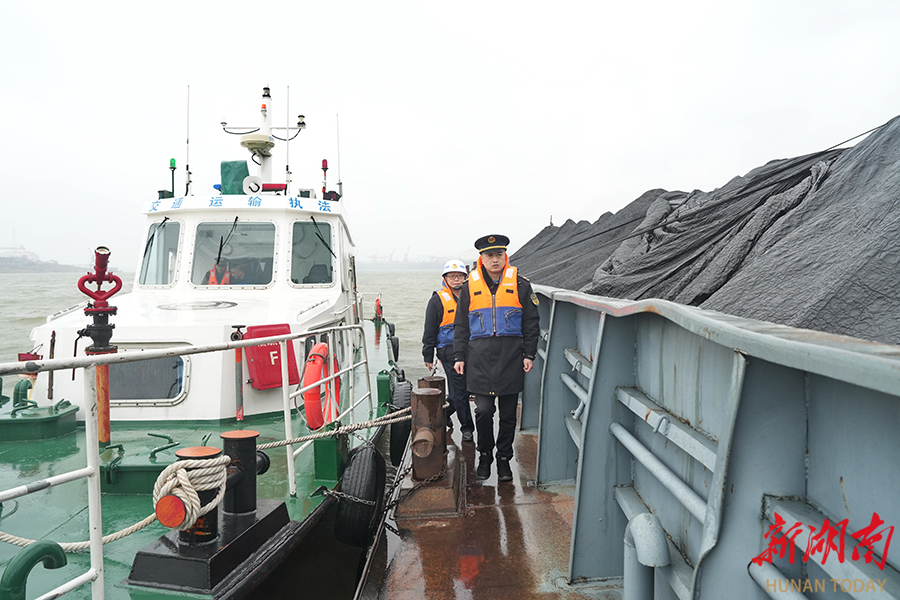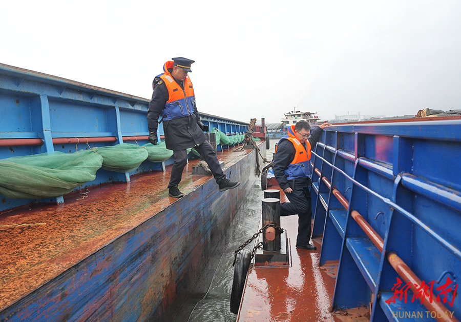 2月16日,执法人员正在长沙综合枢纽下游江面进行登船检查。春节假期,长沙市交通运输执法部门加大对重点渡口、桥区水域和锚地的巡查监管,并向过往船舶发布安全提醒,确保水路运输安全。 湖南日报全媒体记者 童迪 摄
