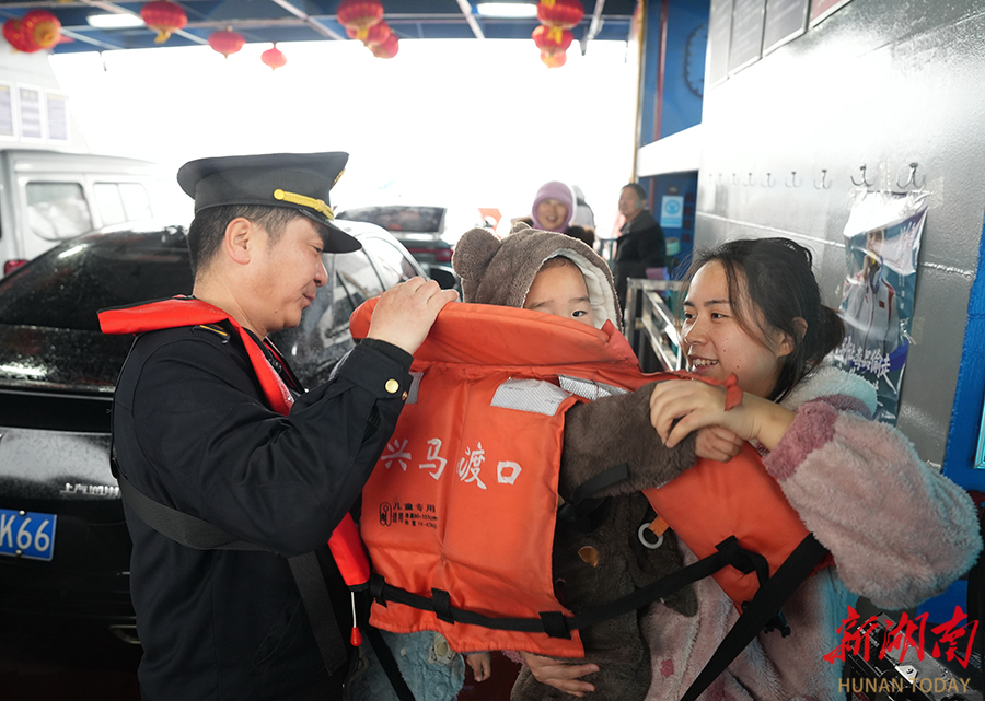 2月16日,执法人员在兴马洲渡口渡船上给小朋友穿戴救生衣。春节假期,长沙市交通运输执法部门加大对重点渡口、桥区水域和锚地的巡查监管,并向过往船舶发布安全提醒,确保水路运输安全。 湖南日报全媒体记者 童迪 摄