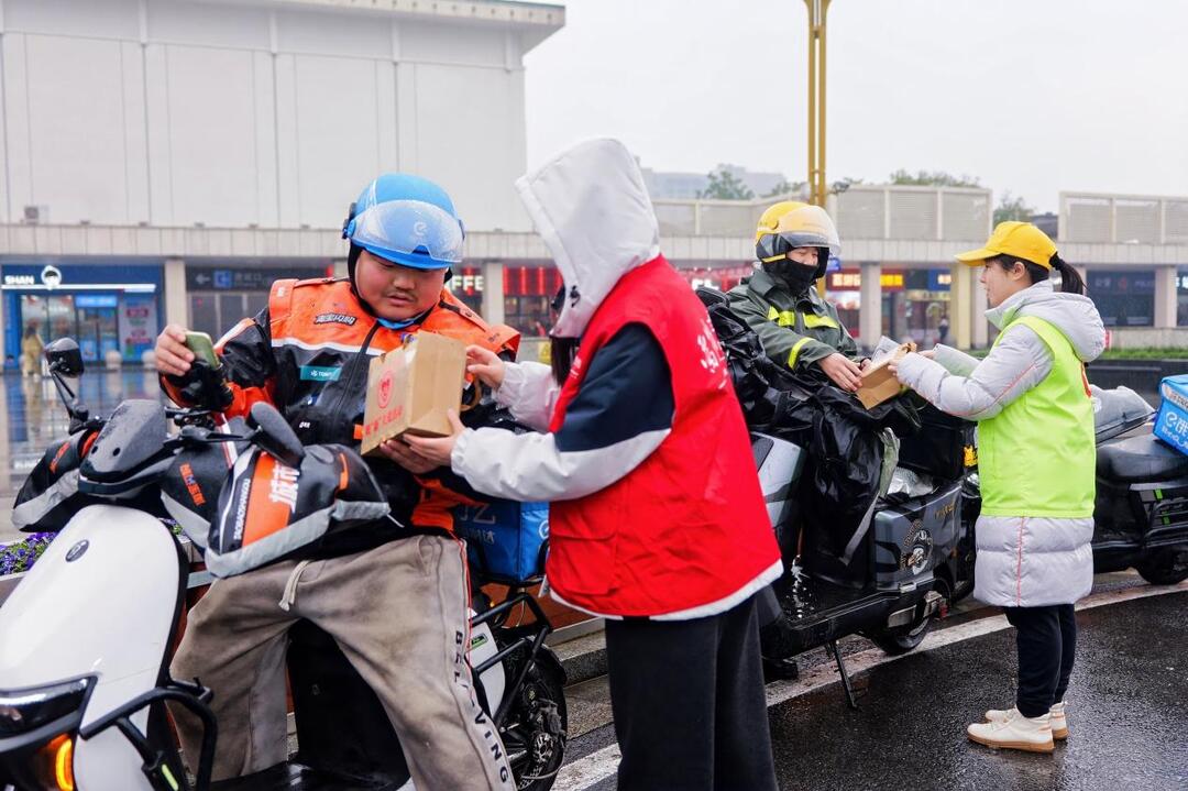 活动现场,志愿者们分工有序、热情服务:一边引导网约车司机规范停靠、有序开展接送站服务,维护车站周边交通秩序;一边向过往外卖小哥温馨叮嘱,提醒他们注意冬季行车安全、做好防寒保暖。同时,志愿者们还为新就业群体送上了精心准备的暖冬物资,包括热豆浆、暖宝宝、充电线、手机支架、充电宝等实用物品,共计100余件,用点滴关怀驱散冬日寒意。