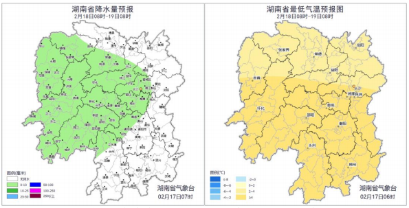 18日白天至晚上,湘中以北多云转小雨,其他地区多云;北风2~3 级;最低气温湘北2~4℃,其他地区4~7℃;最高气温10~17℃。