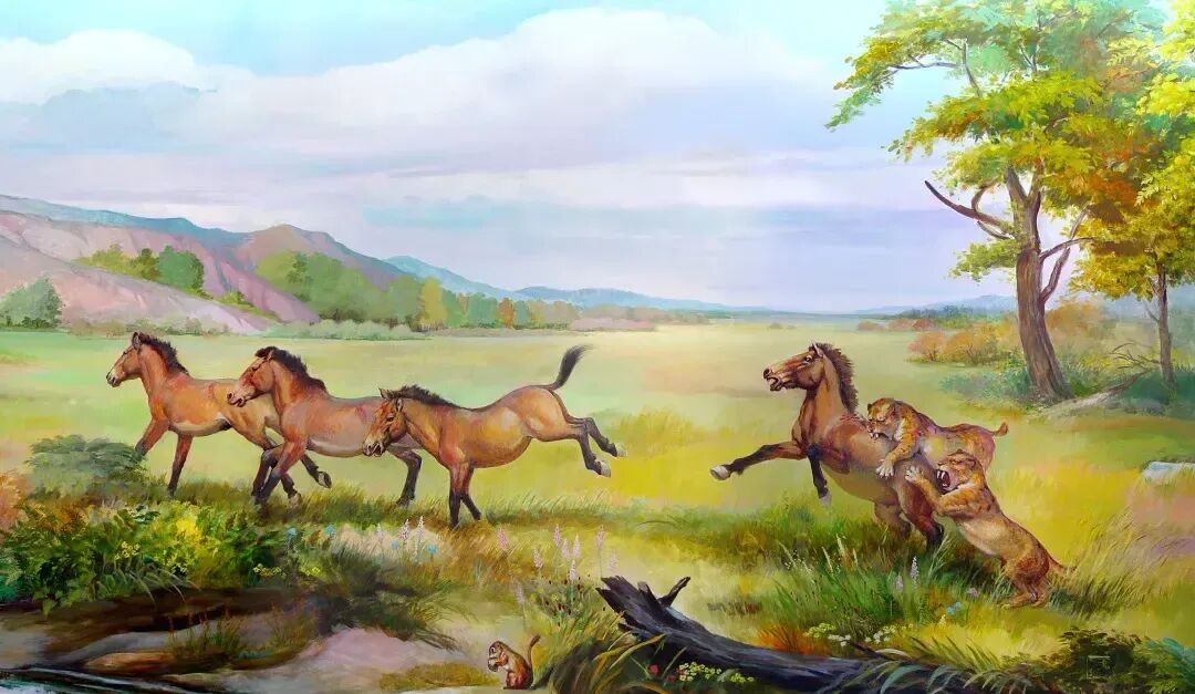 甘肃临夏盆地早更新世(250至220万年前)真马动物群生态复原图(图据中国科学院古脊椎所,李荣山绘)