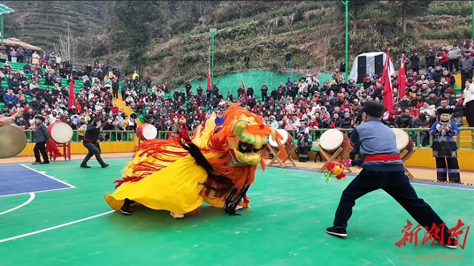开幕式分为六大篇章精彩上演:百狮闹春腾跃欢腾,百鼓迎春气势恢宏,妙手“绘”春展示苗画苗绣与苗服走秀,祈舞贺春献上绺巾舞、竹筒舞、踏鼓舞等非遗表演。茶歌咏春环节,齐唱《阿婆的茶碗》;欢乐新春时刻,苗家儿女同唱《我和我的祖国》,红旗招展、全场同唱,将气氛推向高潮。参赛队伍有序入场,运动员、裁判员依次宣誓,仪式庄重热烈。