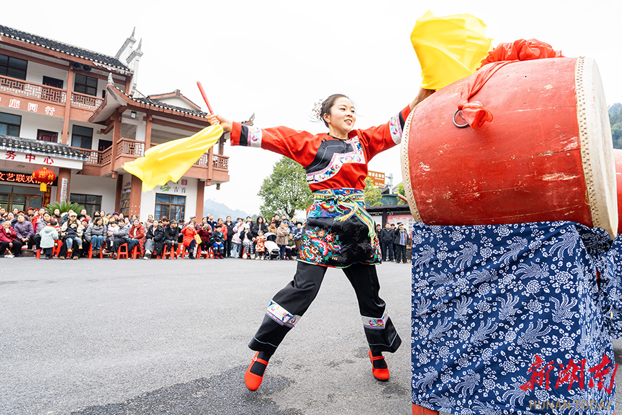 2月17日,吉首市石家冲街道寨阳村,村民在打苗鼓。大年初一,我省各地举办丰富多彩的民俗活动欢庆新春。 梁永鸿 摄(湖南图片库)