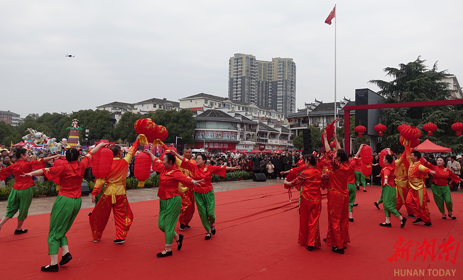 2月17日,麻阳苗族自治县锦江广场,市民在进行民俗表演。大年初一,我省各地举办丰富多彩的民俗活动欢庆新春。 陈刚 摄(湖南图片库)