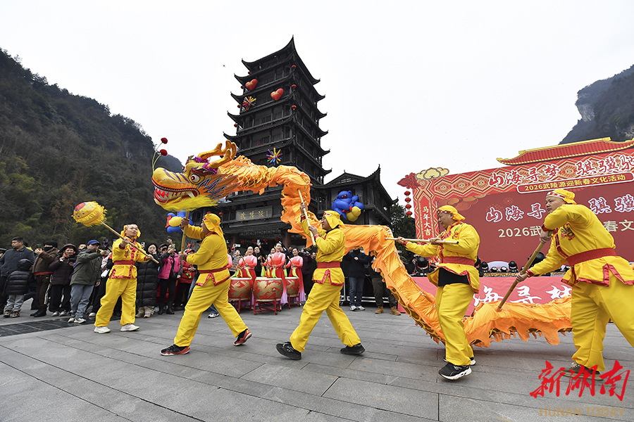 2月17日,张家界市武陵源区标志门广场,民俗舞龙表演队伍在巡游表演。大年初一,我省各地举办丰富多彩的民俗活动欢庆新春。 邵颖 摄(湖南图片库)