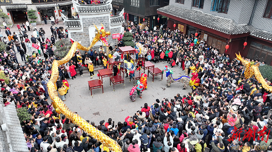 2月17日,凤凰古城,村民在进行舞苗狮、舞龙展演。大年初一,我省各地举办丰富多彩的民俗活动欢庆新春。 吴东林 摄(湖南图片库)