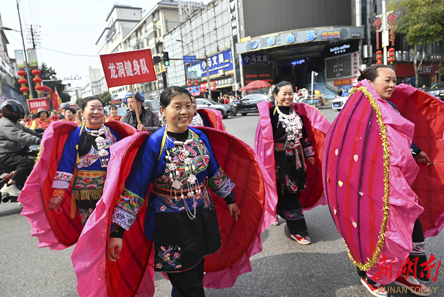 2月17日,花垣县城区,市民在进行民俗表演。大年初一,我省各地举办丰富多彩的民俗活动欢庆新春。 龙恩泽 摄(湖南图片库)
