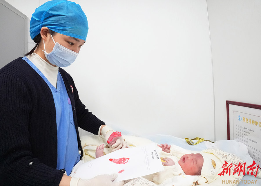 2月17日,南华大学附属第一医院产科,医务人员在为该院马年出生的第一个新生儿采集足印。当天是大年初一,该院医务工作者坚守岗位,守护群众健康。 曹正平 苏冰悦 摄影报道(湖南图片库)