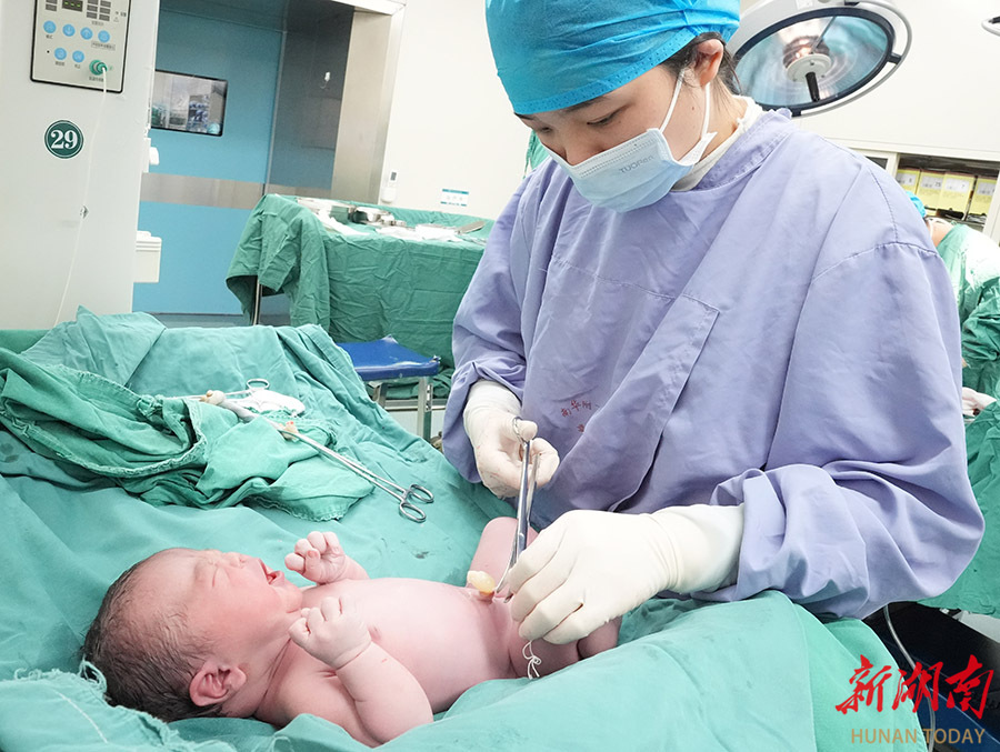 2月17日,南华大学附属第一医院手术室,医务工作者给该院马年出生的第一个新生儿包扎脐带。当天是大年初一,该院医务工作者坚守岗位,守护群众健康。 曹正平 苏冰悦 摄影报道(湖南图片库)