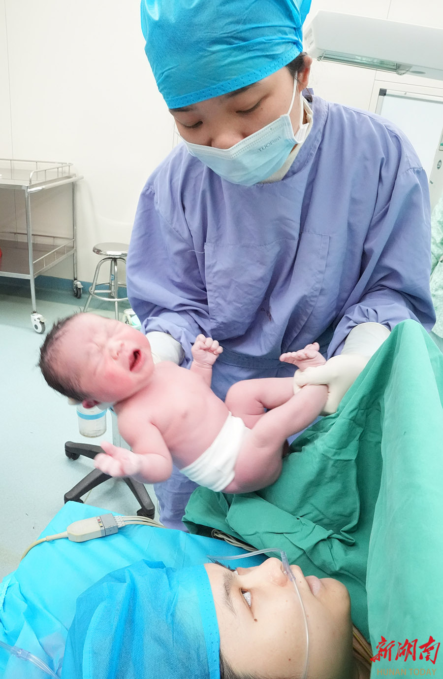 2月17日,南华大学附属第一医院手术室,医务工作者抱着宝宝与妈妈见面。当天是大年初一,该院医务工作者坚守岗位,守护群众健康。 曹正平 苏冰悦 摄影报道(湖南图片库)