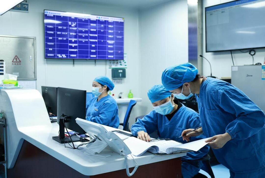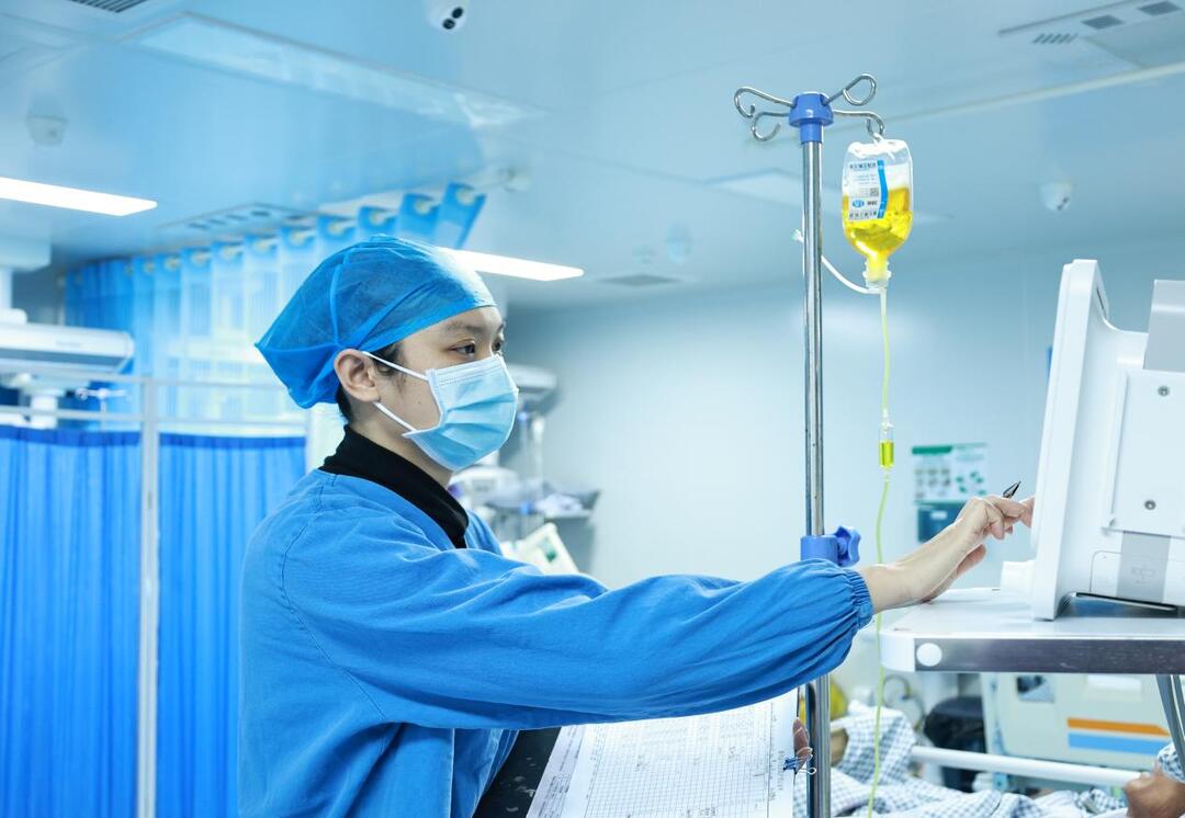 ▲图为新田县中医医院重症监护室护士在认真观察病情,记录监测指标。