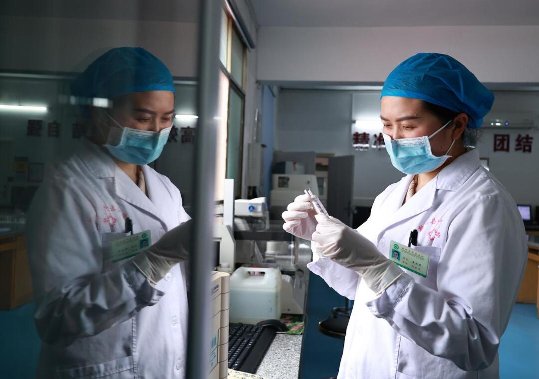 ▲图为新田县中医医院检验人员在认真核对血液标本。